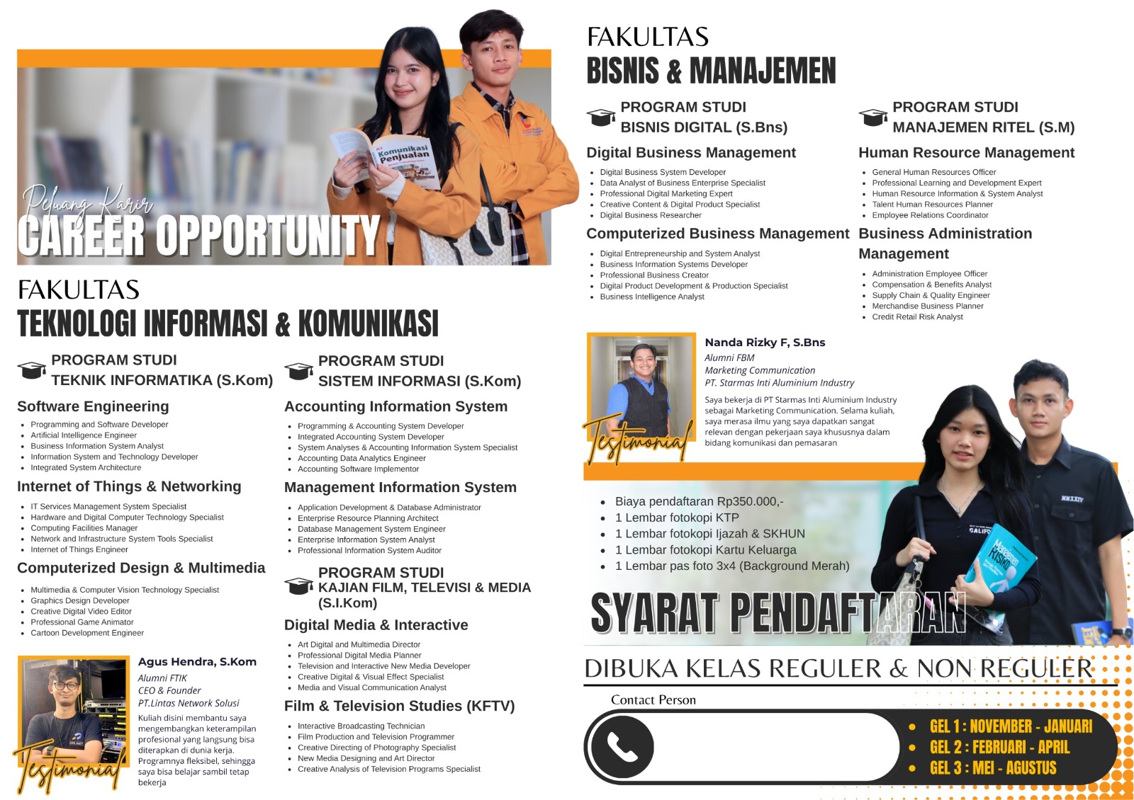 Fakultas Teknologi Informasi & Komunikasi adalah pusat pengembangan talenta digital yang membekali mahasiswa dengan keahlian di bidang teknologi informasi, sistem, dan komunikasi modern untuk menghadapi dunia kerja berbasis digital. Fakultas ini dirancang untuk menghasilkan lulusan yang tidak hanya menguasai teori, tetapi juga memiliki kemampuan praktis dalam pengembangan teknologi, analisis sistem, serta pemanfaatan media digital secara inovatif.